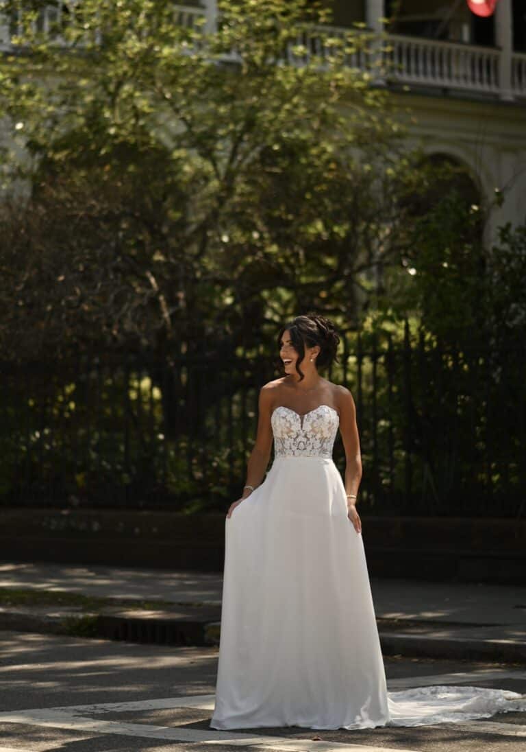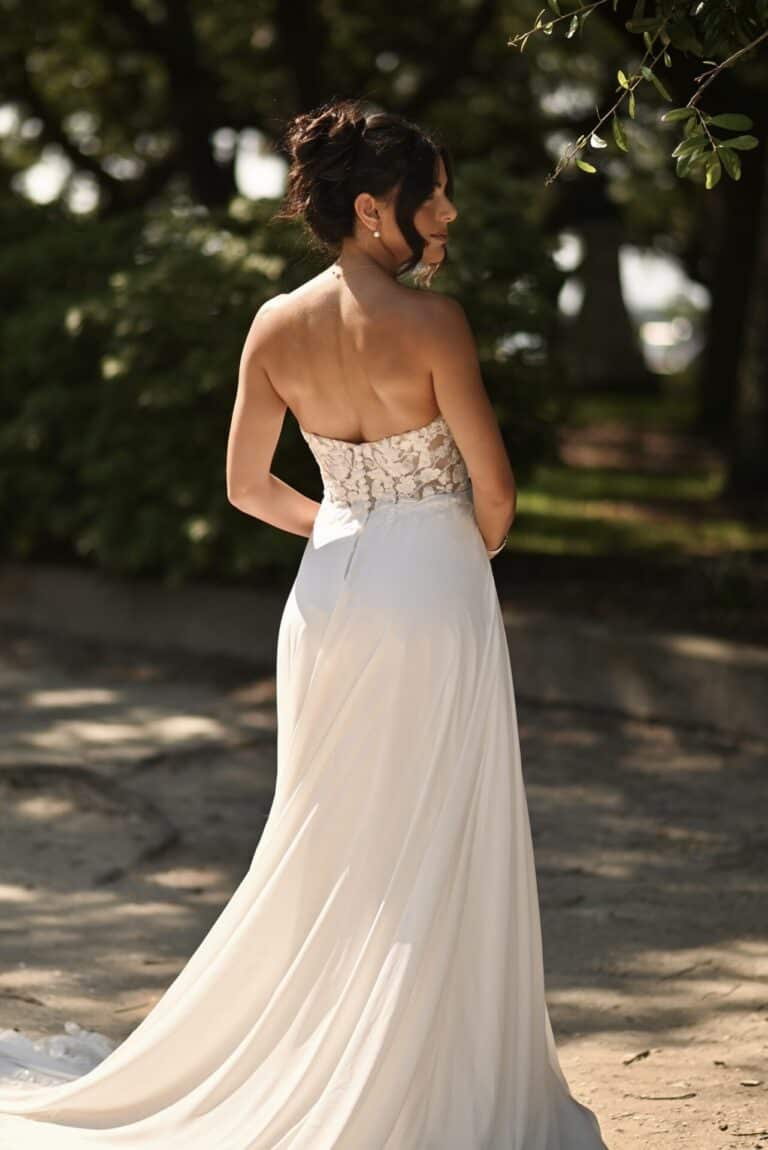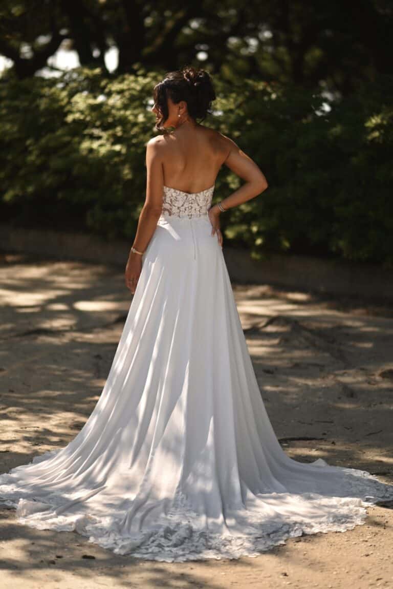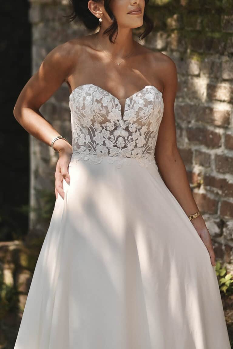 Glamorous lace and crepe chiffon form an unforgettable soft A-line silhouette in Style D3862. The strapless sweetheart neckline bodice is constructed from sheer matte lace, highlighting the beautiful leafy motif and delicate sequin accents. In the back, a small row of timeless fabric-covered buttons meet the waistline, where crepe chiffon drapes into a soft A-line skirt. For the final romantic detail, a gorgeous shaped train is framed in exquisite floral lace.