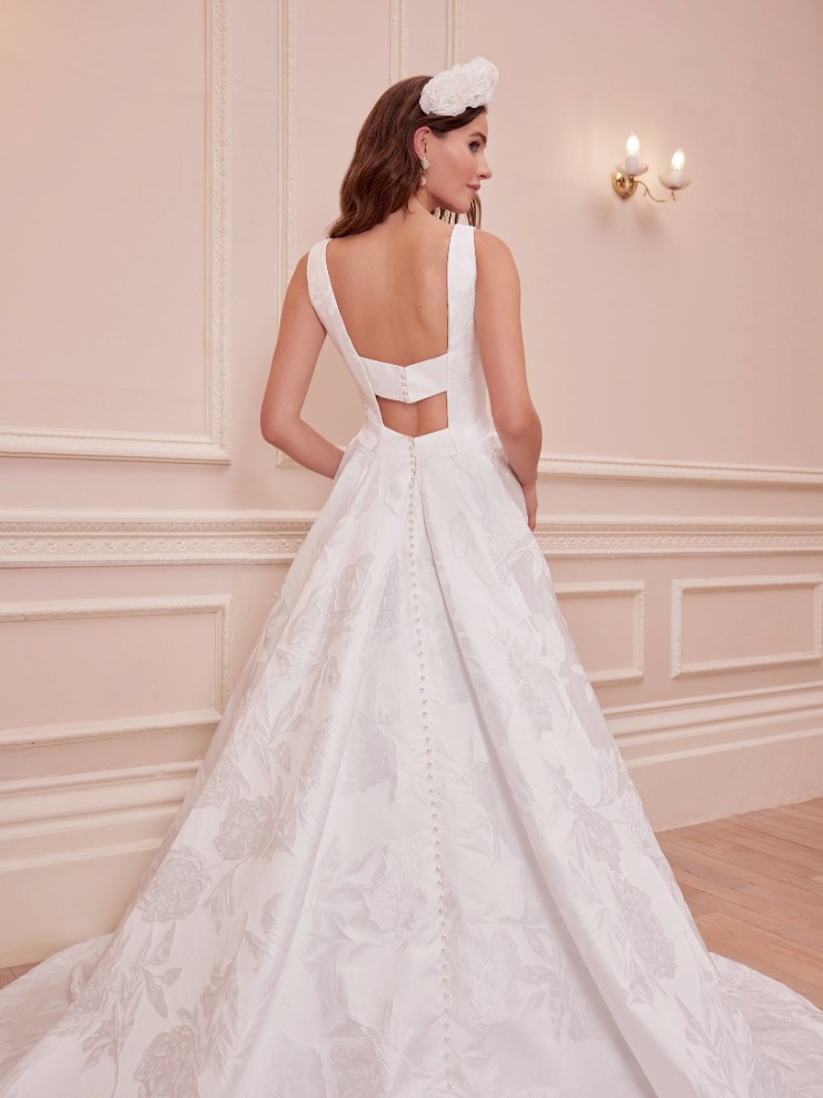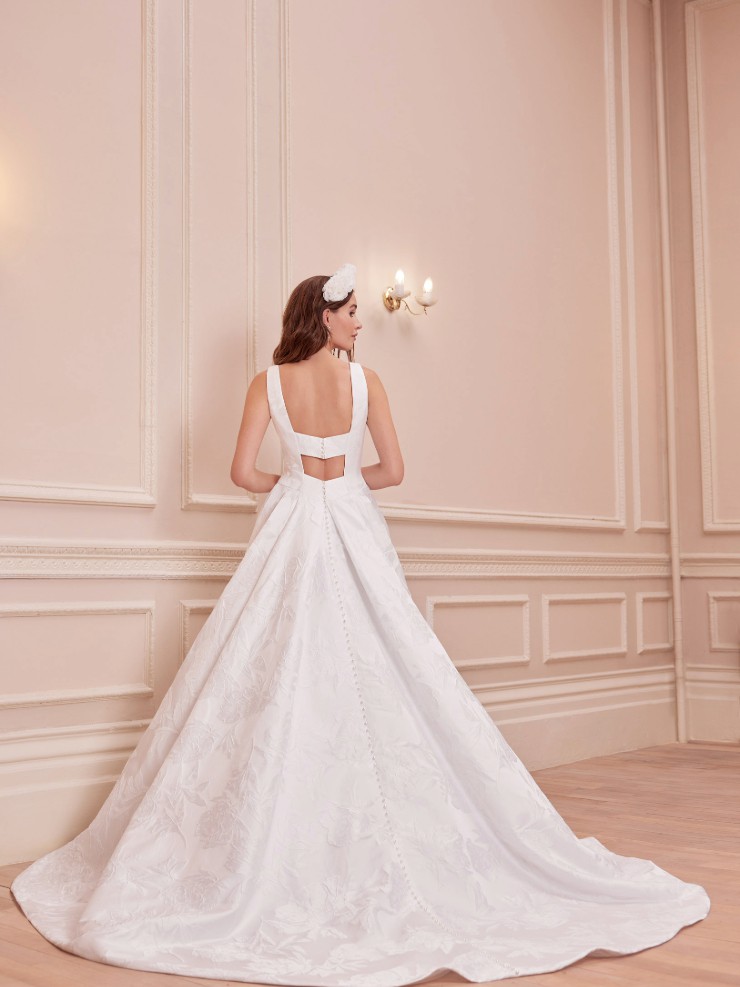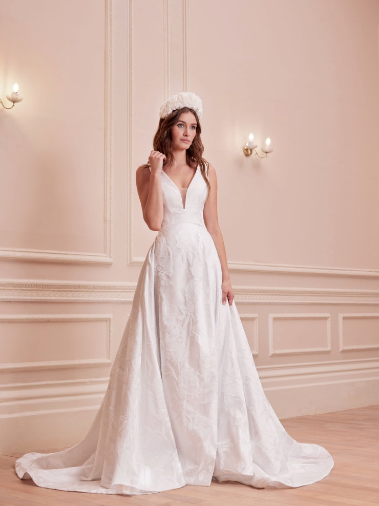 The stunning bodice with its modest plunging V-neckline with illusion panel and it’s cut out open back detail accentuates and helps define the waist. Another flattering feature is Phoebe’s side split, which shows just a hint of leg. This beautiful gown is available in floral jacquard and also Mikado – two completely different looks from two different but both luxurious fabrics.